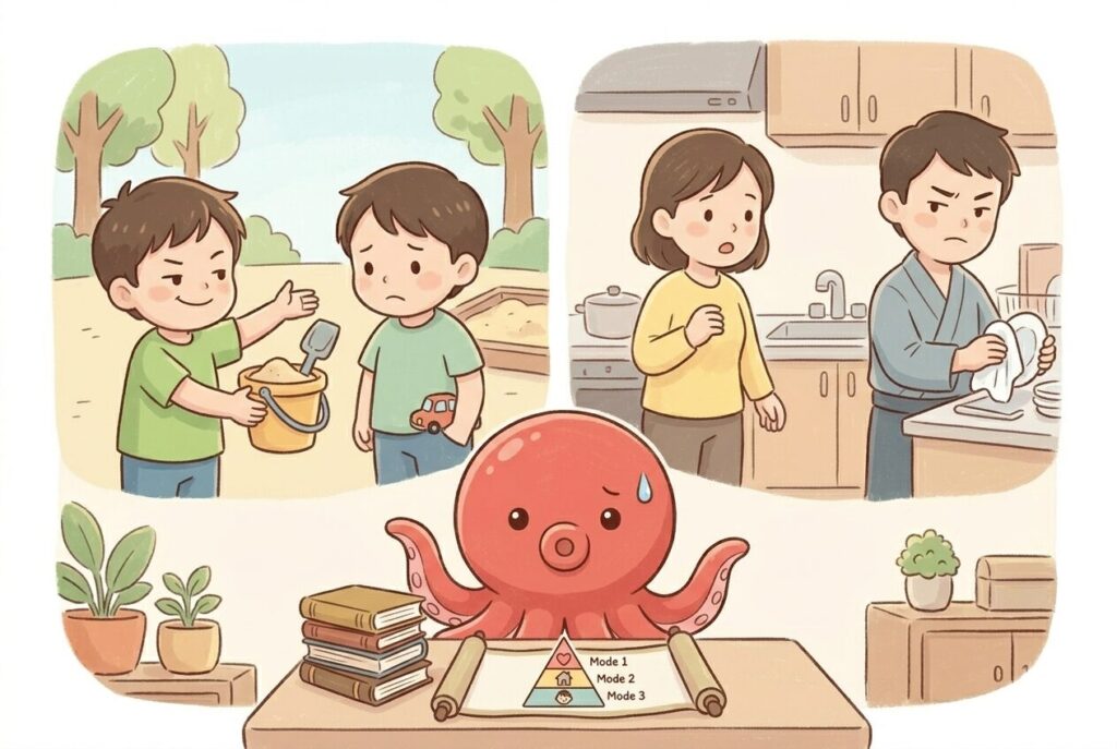- モード①(親の内面)への鏡: ハッとしたのは、私自身でした。妻に対して「昨日はやってくれなかったけど、今日は僕が皿洗いしておくよ」なんて、嫌味っぽく言ったことはなかったか……。子供は、親のこうした「微細なマウント」を敏感にコピーして成長します。