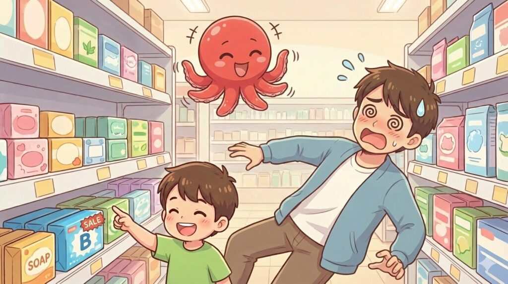 ことの発端は、お風呂で使っている固形石鹸がなくなったこと。 私と息子は、近所のドラッグストアへ買い出しに向かいました。