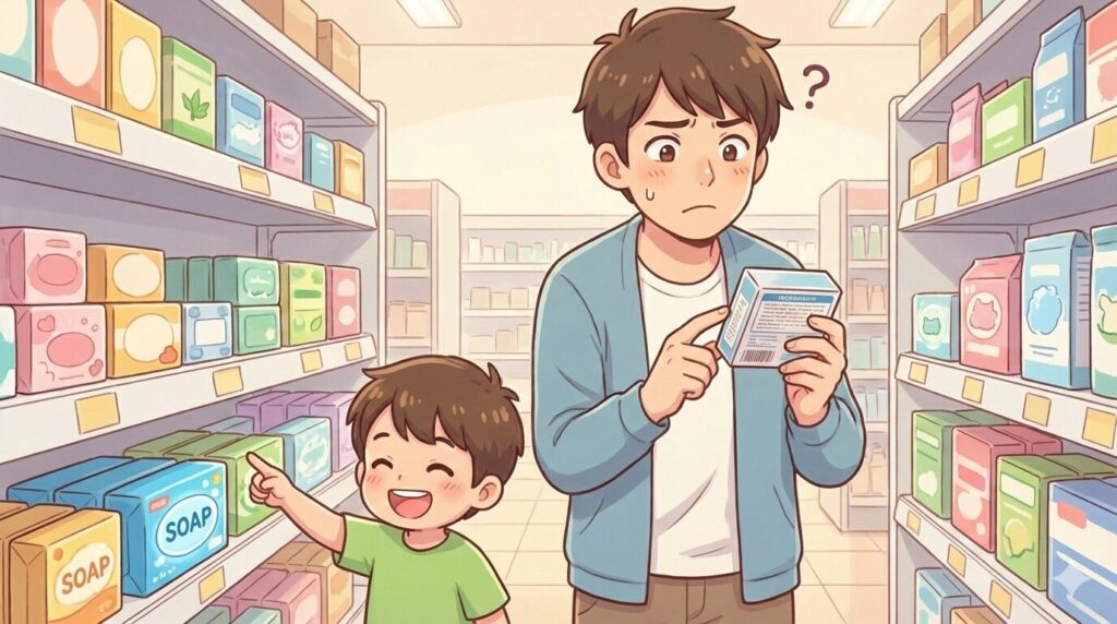 売り場には、色とりどりの石鹸が並んでいます。 私はここで、息子に「賢い買い物の仕方(比較検討)」を教えようと試みました。