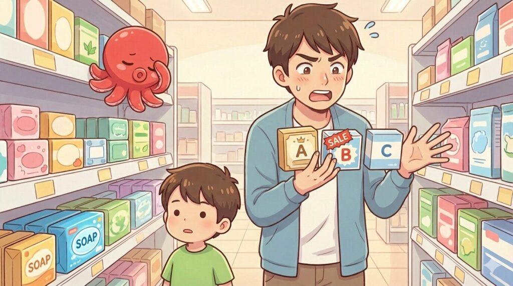 息子は少し考えて、迷わず「B(セール品の石鹸)」を手に取りました。