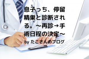 息子っちがお世話になった病院の場合、予定が少し立てづらかったです。手術(入院)当日、退院(翌日)の詳細が前もって分かりませんでした。ある程度時間が必要だろうと予想のうえ、終日予定を開けて、たこさんが対応しました。予想通り、手術中は待合で待って、先生の説明を聞くなど、時間に余裕を持っておくことが必要でした。同じ症状でお悩みの方に、参考になれば幸いです。