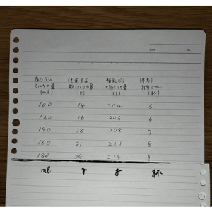 左から、「作りたいミルクの量」「使用する粉ミルクの量」「哺乳瓶+粉ミルクの量」「計量スプーン杯」を記載。