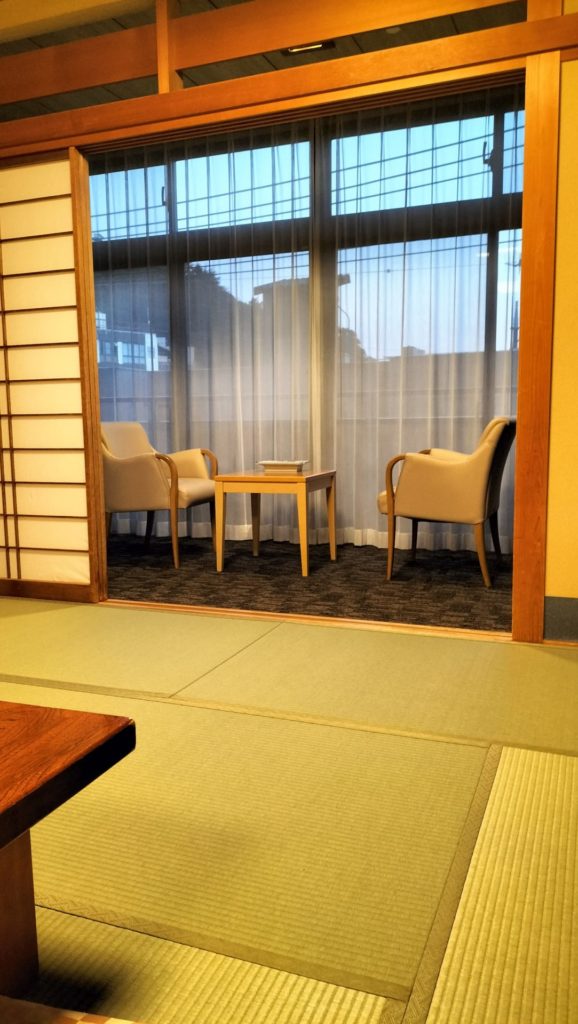 チェックインを済ませてお部屋に到着、少し古さは否めませんでしたが、清潔でした。自宅の床はフローリング、今回の部屋は畳となっているため、少し違和感も感じているようです。息子っちはきょろきょろあたりを見回し、いつもと違う部屋に戸惑っているようでした。すぐに元気いっぱいにずりばいで動き回っていました。