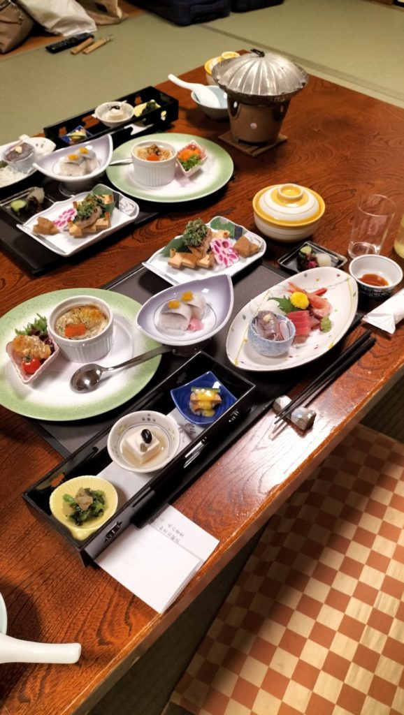 夕食は部屋食のプランを選択。セッテイングされている間にたらふくミルクを飲ませました。テーブルにはいつもと違う、豪華な料理が机の上に並べられます。息子っちにも何となく普段とは違ういい食べ物だ。ということがわかるんですね。「ふーん」「ギャー」などと声を出し、かなりぐずっていました。お怒りモードに突入したようです。
